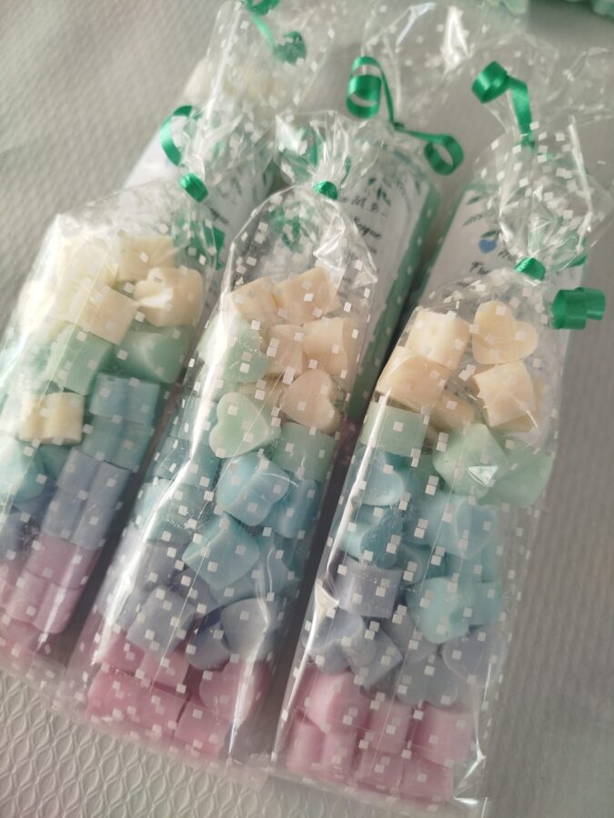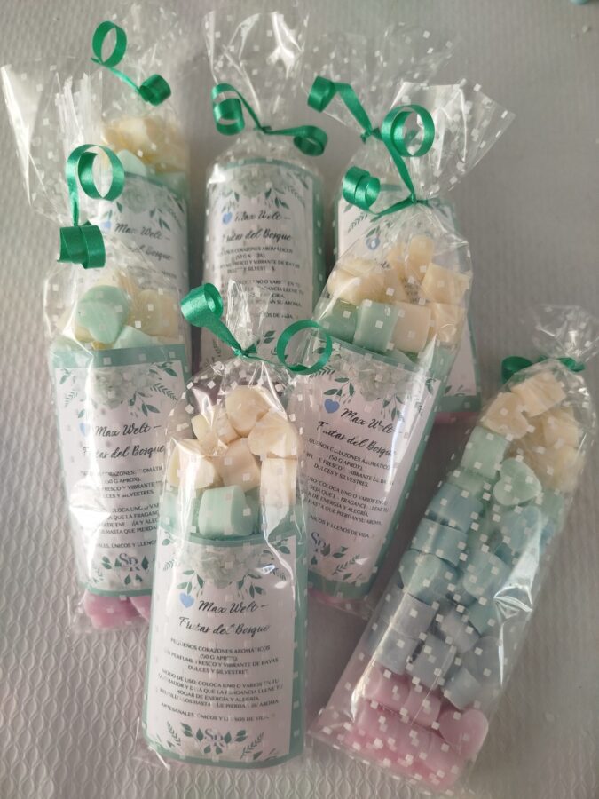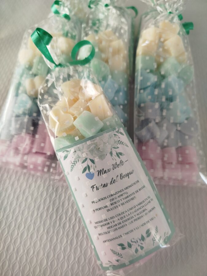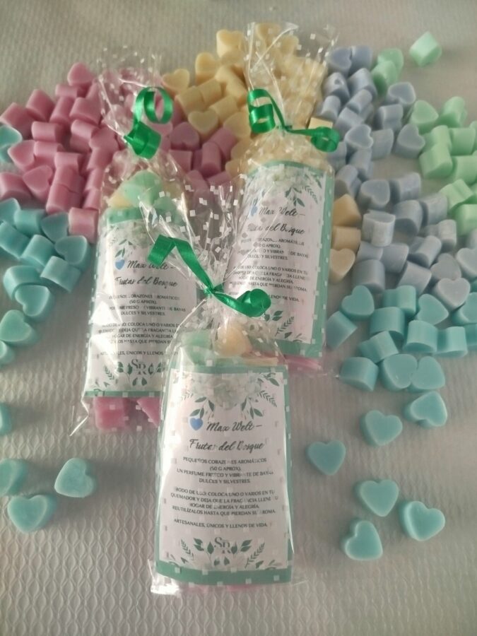 Dulces corazones de cera de soja natural, hechos a mano y con un diseño encantador en tonos suaves y variados. Al colocarlos en el quemador, desprenden un irresistible aroma a piña colada, fresco y tropical, que llenará tu espacio de energía positiva y buen humor.