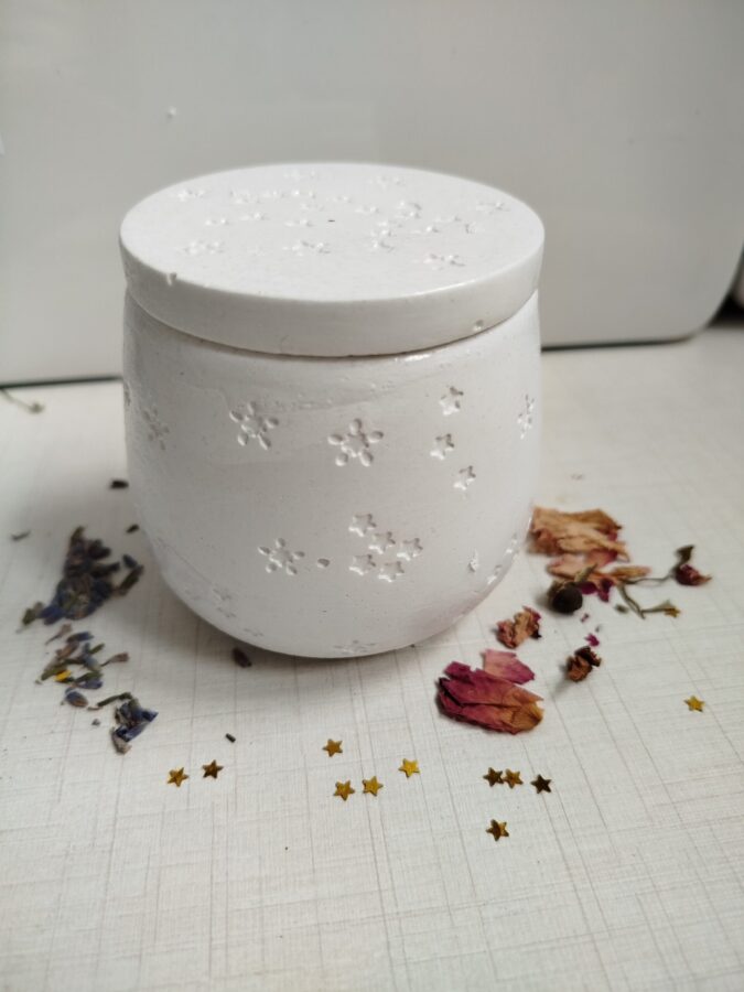 Elaborada en cuenco artesanal con tapadera, color blanco natural y sellado transparente. Cuenco reutilizable.