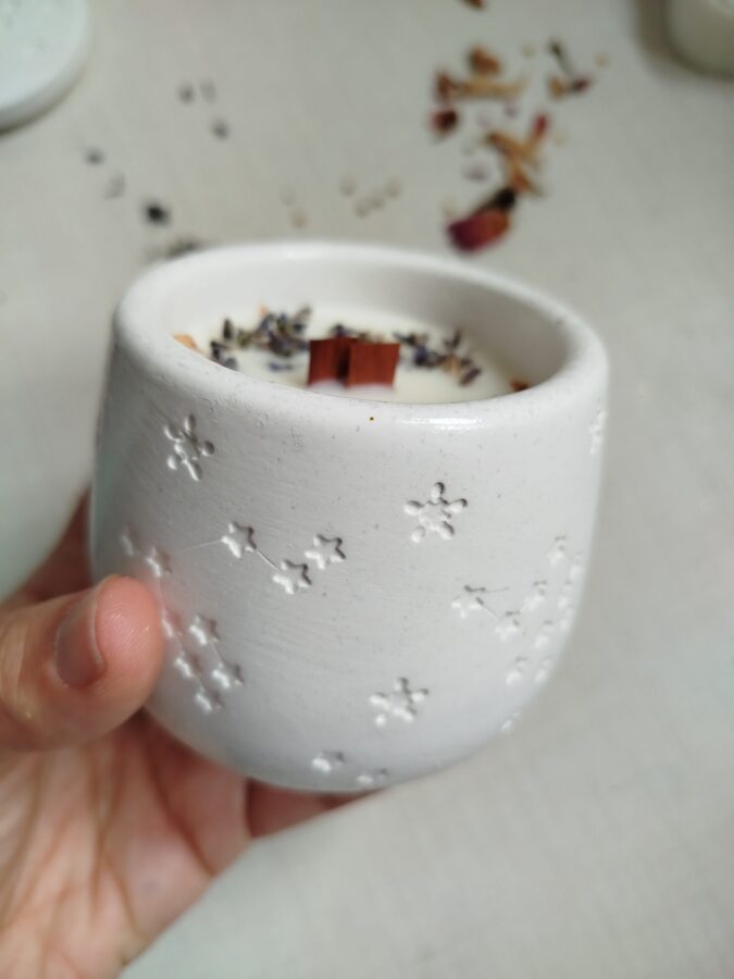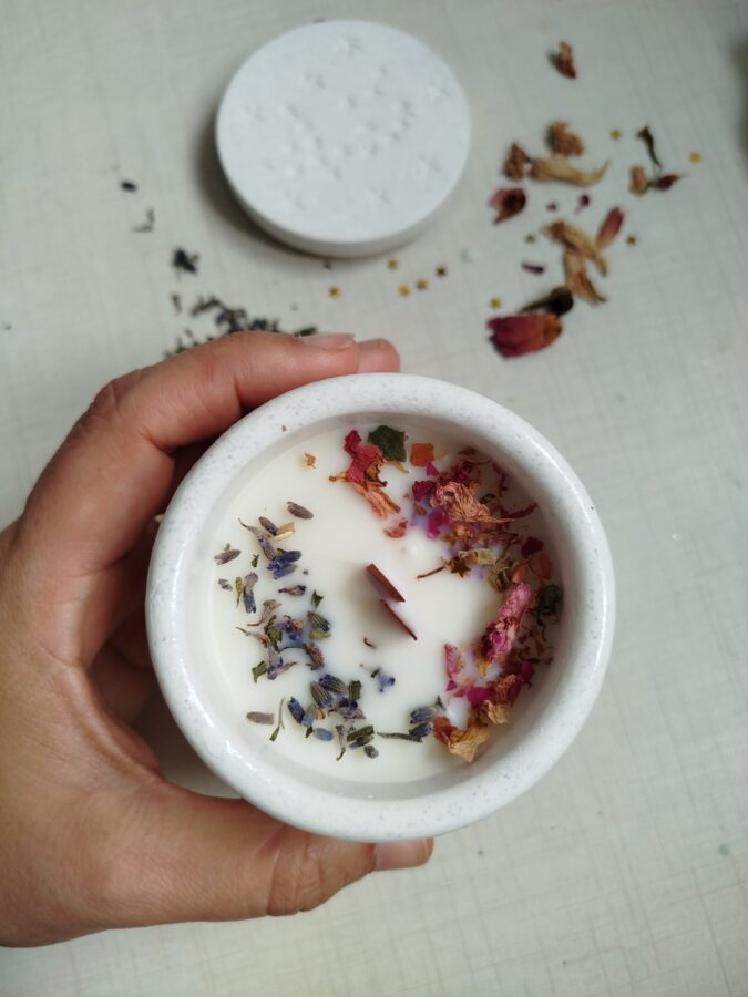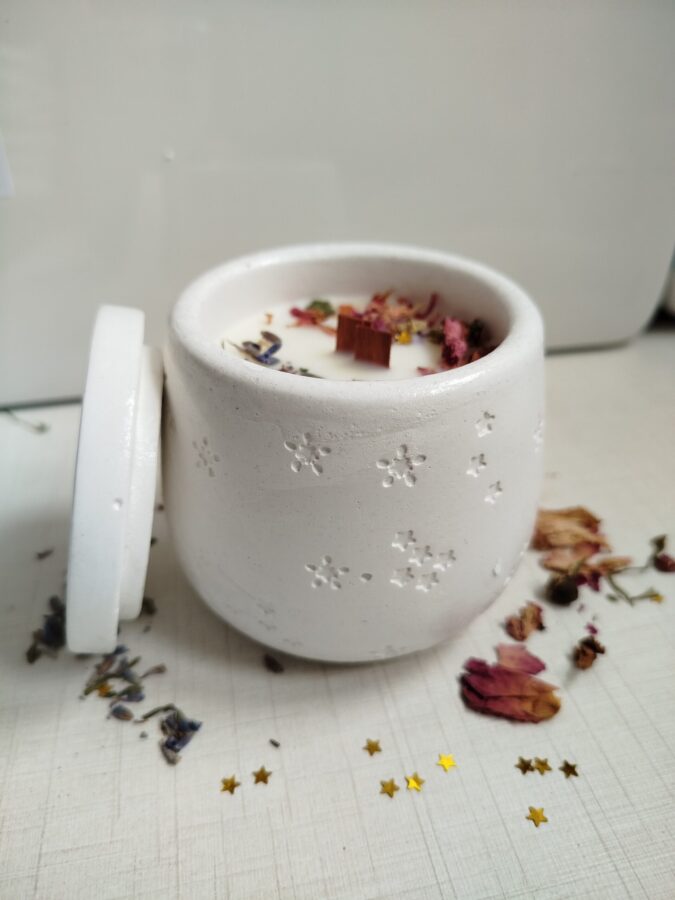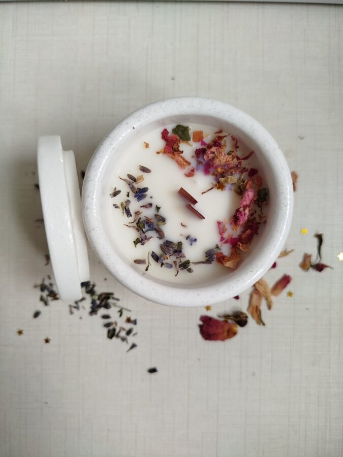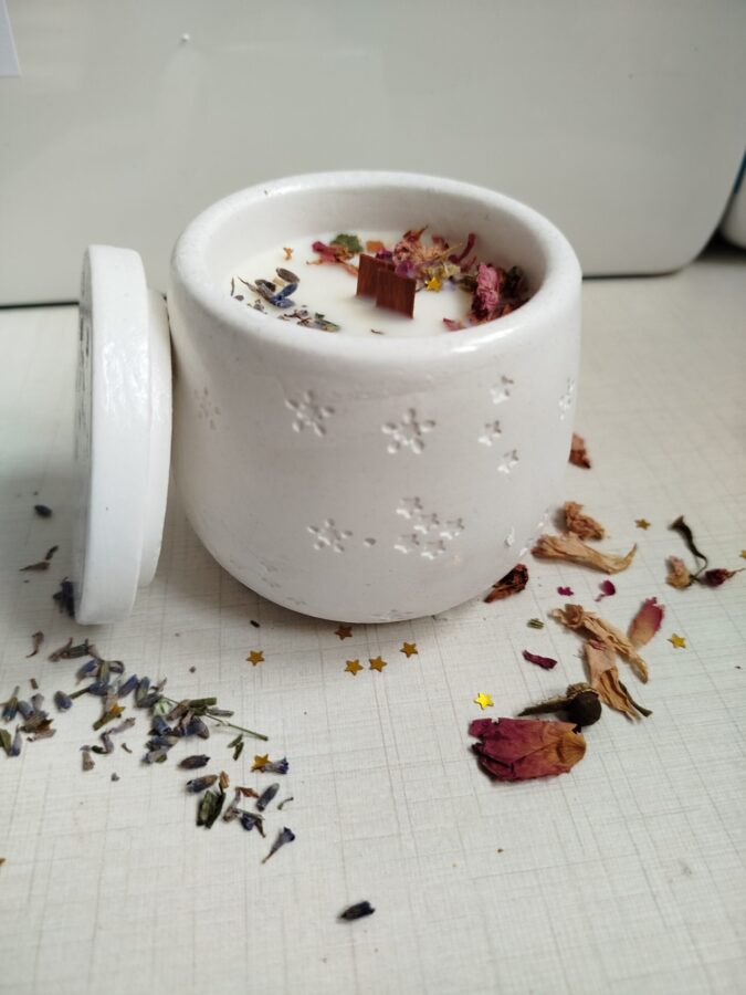 Sumérgete en la magia del cosmos con esta vela artesanal en cuenco con tapadera, decorada cuidadosamente con flores secas que la convierten en una pieza única. Cada vela encierra en su interior fragancias especiales que iluminan el ambiente con energía y calma, como si encendieras una pequeña constelación en tu hogar.